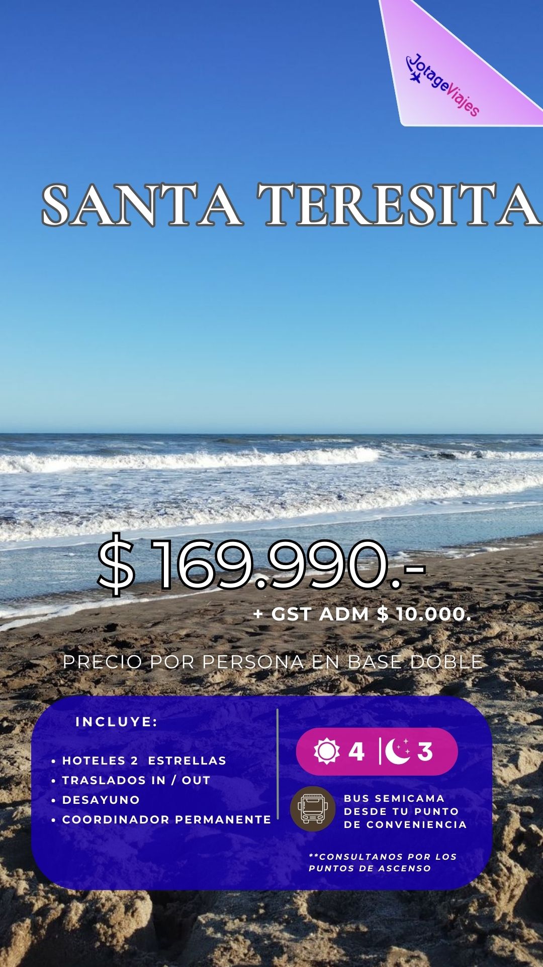 Precio final por persona $169.990. + $10.000.- gst Adm -Precio final en base doble